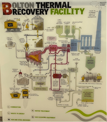 By Wednesday I was up in Manchester, where my morning consisted of a site tour around the Bolton energy from waste facility. Unlike the relatively new Severnside EfW, this site has a long-standing history processing waste from Manchester’s residents, with its original stack and furnace from 1969 still being used. Today, the furnace has had a major re-design, and now includes water walls to increase the efficiency of the plant, as there are now fewer ash build ups, and a better steam flow. When Bolton EfW was originally built, a different type of waste was coming through, making it fit for purpose – the standard of both input and output was also lower than today. The plant has successfully processed Manchester’s waste in the past, and is continuing to do so in the present.